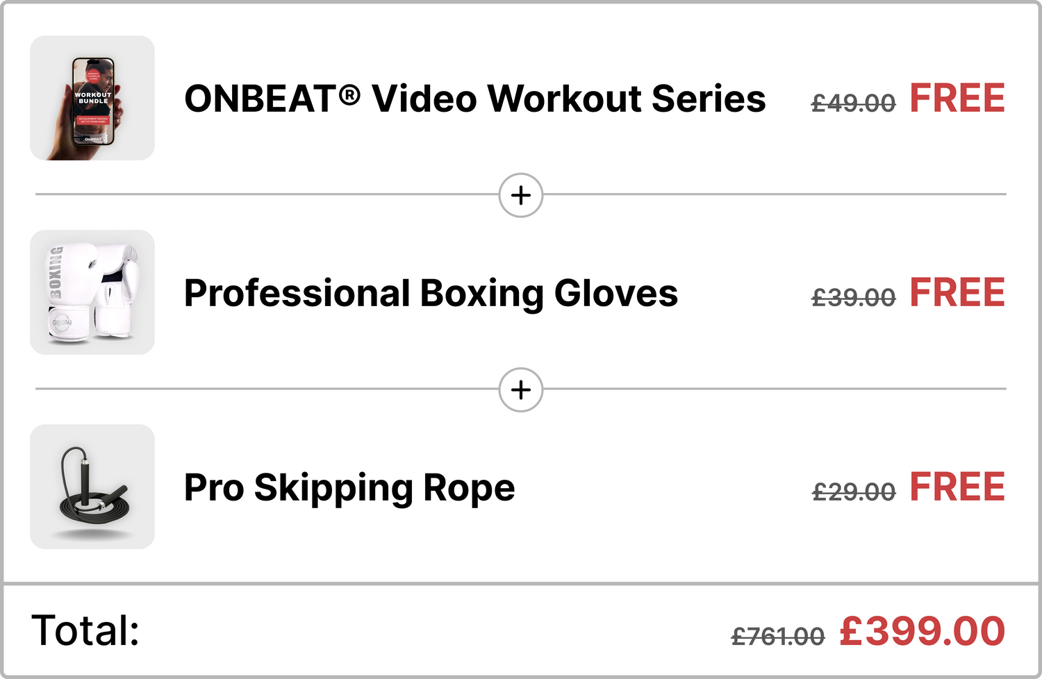 In addition, you’ll receive a three-part video workout series. This includes a full-body cardio workout, a shadowboxing routine, and a skipping rope workout. These follow-along videos are perfect for keeping you engaged and motivated while training from home. After your order is placed, you’ll receive an email from The ONBEAT Team with links to download your eBook and workout videos at no extra cost.