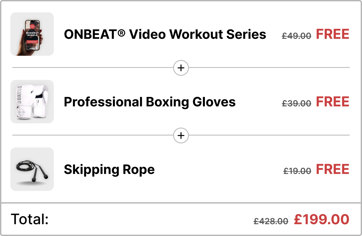 In addition, you’ll receive a three-part video workout series. This includes a full-body cardio workout, a shadowboxing routine, and a skipping rope workout. These follow-along videos are perfect for keeping you engaged and motivated while training from home. After your order is placed, you’ll receive an email from The ONBEAT Team with links to download your eBook and workout videos at no extra cost.